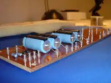 Turret boards consist of a thin (generally 1/8 inch) piece of non-conductive material drilled in pattern to match the electronic layout of a set of components. Each hole drilled will have a turret positioned in it. Electronic components are suspended between these turrets and soldered to them to create a complete circuit layout.