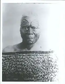 ![]() Karewa, c. 1890–1920 with moko (facial markings) enhanced by the photographer | |