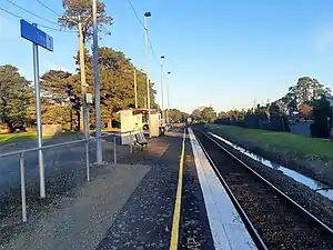 Until February 1986, the station consisted of a waiting room, basic toilets and a ticket office.[2] As part of a government rationalisation of public transport, these facilities were no longer deemed necessary, and the buildings were demolished and replaced with the current shelters.[2]