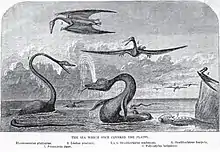 One of the earliest restorations of Tylosaurus comes from an illustration by a popular artist named Henry Worrall for paleontologist William E. Webb's 1872 fictional book Buffalo Land. This illustration, which is titled The sea which once covered the plains, represents one of the first paleoart of marine reptiles and pterosaurs from the Niobrara Formation. At the center of the illustration rises a giant Tylosaurus (identified as Liodon proriger). The appearance of this mosasaur was influenced by Cope, who was an acquaintance of Webb, as evidenced by its excessively elongated tail and serpentine appearance.[44] Additionally, the Tylosaurus was given a rather long neck. Although not as long as those of plesiosaurs like Elasmosaurus, this detail would influence subsequent depictions of Tylosaurus in art. An example of this can be seen in the famous fossil collector Charles Hazelius Sternberg's 1889 fictional narrative The Young Fossil Hunters: A True Story of Western Exploration and Adventure, which contains a scene where a giant Tylosaurus skeleton measuring 80 feet (24 m) in total length with a long and slender neck that is 20 feet (6.1 m) long is uncovered.[39]