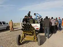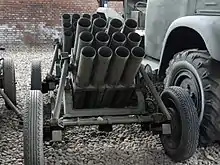 The launcher's 12 tubes are arranged in three removable rows of four each, mounted on a single-axle carriage with rubber tires. The Type 63 originally fired an 18.8 kilogram rocket (Type 63-2)[6] with a 1.3 kilogram warhead.[7] Ammunition for the Type 63 was later improved (Type 75 and Type 81 series), although the overall weight of the rocket remained the same.[5] A fixed amount of propellant is contained in the rocket motor. The steel-cased rocket is stabilized with spin imparted by six angled nozzles in its base. Type 63 rockets may be launched without the launcher; improvised firing can employ tubing, rails or even dirt berms.[8][9] The Type 63 was distributed on the basis of six per infantry regiment, or 18 per infantry division.[10] For airborne and mountain units the lighter Type 63-I was developed.[11]