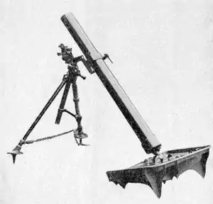 The Type 97 81 mm infantry mortar was a Japanese mortar used primary by Imperial Japanese Army during World War II. The Type 97 designation was given to this gun as it was accepted in the year 2597 of the Japanese calendar (1937).[2] It entered service in 1937. Japanese infantry units often are equipped with 81-mm mortars. The Type 97 81 mm mortar is very commonly used and is referred to by the Japanese as an "Infantry Gun",[2] which breaks down into 3 sections for transport. The markings which appear on the base of the barrel read "97 model small trench mortar."[3]