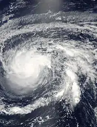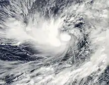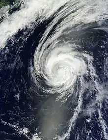 After leaving the Marianas Islands, the eye of Dolphin became much larger as the storm developed strong outflow channels, both indicative of further strengthening.[20] On May 16, the typhoon began rapid deepening as it reached the western periphery of the ridge, causing it to turn more to the north.[21] At 06:00 UTC that day, the JMA estimated peak 10 minute winds of 185 km/h (115 mph).[4] Based on the well-defined structure and Dvorak ratings of T7.0, the JTWC upgraded Dolphin to a super typhoon late on May 16 with 1 minute winds of 260 km/h (160 mph).[22] The approaching westerlies turned Dolphin to the north and northeast on May 17 while also imparting unfavorable conditions, causing the eye and the convection to elongate and weaken.[23] By May 18, increased wind shear had exposed the circulation as the winds continued to drop.[24] After the convection decreased further, the JTWC discontinued advisories on Dolphin on May 19, once Dolphin was beginning to become extratropical near the Japanese island of Iwo Jima.[25] On the next day, the winds fell below typhoon force, and at 00:00 UTC on May 21, the JMA declared Dolphin extratropical. The storm accelerated to the northeast, passing through the Aleutian Islands on May 22. The storm slowed once reaching the Gulf of Alaska, turning eastward to cross the International Date Line on May 24.[4]