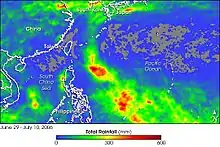 Typhoon Ewiniar, known in the Philippines as Typhoon Ester, was the third named storm of the 2006 Pacific typhoon season and one that lasted for twelve days as a tropical cyclone, moving on a generally northward track. During its lifespan, it affected Palau, Yap, eastern China, the Ryūkyū Islands of Japan, South Korea as well as North Korea, briefly threatening to make landfall in North Korea before doing so in South Korea. Ewiniar is responsible for at least 181 deaths. However, an unofficial report stated that up to 10,000 people had been killed by flooding in North Korea,[1] with 4,000 people missing.[2]