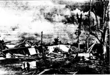 Surveys of damage revealed belt-like damage patterns from the winds, with some homes being leveled and others nearby having only minor damage, akin to the impacts of tornadoes.[13] The winds uprooted and snapped palm trees across the island and, in some instances, stripped the bark of tree trunks and branches as if they had been sandblasted.[1] Vegetation was completely defoliated across central areas of the island. In some places, it was described as the aftermath of a forest fire.[13] The winds also blew debris across the island. Metal roofing was found wrapped around trees.[9] In one instance, a twin-engine aircraft was carried 2.4 km (1.5 mi) from the hangar it was tied down in. A metal sign bolted into a warehouse was tossed 3.7 km (2.3 mi) and found half-buried in the ground.[13] Elsewhere, a quonset hut was lofted and carried for 125 m (411 ft), intact, before being crushed on impact.[4] Along the coast, USS Arco was torn from her moorings, severing two anchors and shearing a cleat – tested for over 23,000 and 45,000 kg (50,000 and 100,000 lb), respectively – in the process.[4][13] ROK Han Ra San and RPS Negros Oriental sank in the inner harbor of Guam.[15]