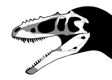 Cladistic analyses of tyrannosaurid phylogeny often find Tarbosaurus and Tyrannosaurus to be sister taxa, with Daspletosaurus more basal than either. A close relationship between Tarbosaurus and Tyrannosaurus is supported by numerous skull features, including the pattern of sutures between certain bones, the presence of a crescent-shaped crest on the postorbital bone behind each eye, and a very deep maxilla with a noticeable downward curve on the lower edge, among others.[10][15] An alternative hypothesis was presented in a 2003 study by Phil Currie and colleagues, which found weak support for Daspletosaurus as a basal member of a clade also including Tarbosaurus and Alioramus, both from Asia, based on the absence of a bony prong connecting the nasal and lacrimal bones.[20] Alioramus was found to be the closest relative of Tarbosaurus in this study, based on a similar pattern of stress distribution in the skull.