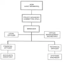 The TzNIC members are at the top of the hierarchy, constituting the main portion of the body, followed by the Policy Advisory Committee (PAC) and then the Manager. The Manager coordinates the Legal, Financial and Technical Officers and the Office Management Secretary. An Accounts Assistant assists the Financial Officer and a Systems Engineer assists the Technical Officer.[1]