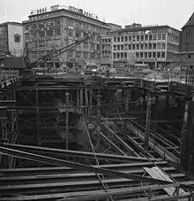 During the construction of the tunnels for subway line A, different methods were used over the years. The easiest way was the construction of the section in the northwest city, since here the subway line had been taken into account as planned and was built together with the other buildings. The first phase of construction (Alleenring Hauptwache) and its later extension to Theaterplatz (now Willy-Brandt-Platz) were still completely open-plan. For this purpose, a correspondingly deep excavation pit was dug and secured with the aid of numerous steel girders and screed walls driven into the ground (Berliner Verbau).