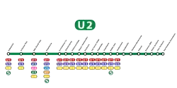 The U2 is a line on the Frankfurt U-Bahn. At the time of the line's inauguration in 1968, it ran from the south railway station to the Hauptwache and then continued along the Eschersheimer Landstrasse all the way up to Heddernheim and then continued to their terminus in Bad Homburg.
