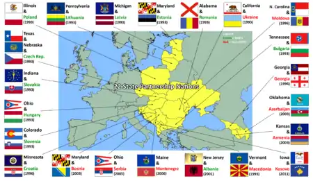 The EUCOM State Partnership Program consists of 22 State/Country partnerships. The following is a list of each partnership with the year they were formed in parenthesis.[14]