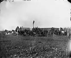The Telegraph Construction Corps were charged with the dangerous job of building telegraph lines in the field during battles. Consisting of about one hundred fifty men, the Telegraph Construction Corps set out in wagon trains to construct temporary lines.[15] During a battle, one wagon was stationed at the starting point of the battle to act as a receiving station, while another wagon traveled into the field to be a sending station.[16] Thus, the orders could be sent back and forth between general headquarters and the battlefield, and what occurred during the battles could be sent back to the Military Telegraph Office in Washington, D.C.