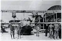 Due to some grievance, a general strike was called by the civilian workforce during the erection of the first hangar, but the strike was soon mitigated.[2] By 1 August 1918, there was still a considerable amount of minor work to be accomplished, and it was rapidly nearing the time for the arrival of the seaplanes. The first hangar had been completed by the civilian contractors along with the reservoir, the small water tank and majority of the road forming. The civilian workforce was dismissed on 15 August. The erection of the second hangar immediately started and the work progressed rapidly.
