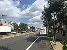 When the Sproul Road Bill was passed in 1911, the road between Chester and Philadelphia was legislated as part of Legislative Route 180 and as Legislative Route 150 between Philadelphia and Morrisville.[15] With the creation of the U.S. Highway System in 1926, US 13 was designated through Pennsylvania from the Delaware border in Marcus Hook northeast to US 1/PA 1 at Bridge Street in Morrisville.[16] The route followed Post Road between Marcus Hook and Chester, Chester Pike between Chester and Darby, and Main Street through Darby before it reached Philadelphia. US 13 passed through Philadelphia along Woodland Avenue, Market Street, Broad Street, Diamond Street, Front Street, Kensington Avenue, and Frankford Avenue. The route continued into Bucks County and followed Bristol Pike to Morrisville, where it headed north on Philadelphia Avenue and Pennsylvania Avenue to US 1. In Philadelphia, US 13 ran concurrent with US 1 on Woodland Avenue north of Baltimore Avenue, US 1 and US 30 on Market Street and Broad Street north to Vine and Race streets, and US 1 on Broad Street between Vine Street and Diamond Street.[16][17][18] US 13 was originally designated concurrent with PA 91 between the Delaware border and Philadelphia and with PA 32 between Philadelphia and Morrisville, where that route continued north along the Delaware River.[19] In 1928, the concurrent PA 91 and PA 32 designations were removed.[20]