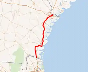 All of US 17 in Georgia that does not have a local street name is known as Ocean Highway (alternatively spelled "Ocean Hiway"), which was the name of an auto trail established in 1935 connecting Jacksonville, Florida with New York, New York.[5] The Georgia General Assembly made the Ocean Hiway designation official in a 1958 resolution that recognized the concerted advertising effort of the Ocean Hiway Association, its impact on tourism, and the signage of the highway in the coastal states to the north.[6] SR 25 travels concurrently with US 17 for almost its entire length in the state. The highways split at the I-16/I-516 interchange in Savannah; US 17 follows I-16 and its unsigned companion SR 404 and then SR 404 Spur to the South Carolina state line at the Savannah River, while SR 25 heads northwest along the old route of US 17 to Port Wentworth to cross the river upstream from the city. US 17 is a part of the National Highway System from US 82/SR 303/SR 520 west of Brunswick to SR 25 Spur in Brunswick, and from just southwest of Richmond Hill to the South Carolina state line.[7][8][9]