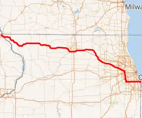 U.S. Route 20 (US 20) in the U.S. state of Illinois is a major arterial highway that runs from the Iowa state line at East Dubuque at the northwestern tip of Illinois, to the Indiana state line at Chicago south of the Chicago Skyway, a distance of 233.93 miles (376.47 km).[1] For its entire length, US 20 is designated as the General Ulysses S. Grant Highway, often abbreviated the U.S. Grant Memorial Highway. However, this name is only commonly used west of Elgin. US 20 bypasses the city of Elgin on a freeway known as the Elgin Bypass or Dr. Martin Luther King Jr. Memorial Highway.[2] From Elgin to Melrose Park, US 20 follows Lake Street. It then follows Mannheim Road, and further south La Grange Road. US 20 also follows 95th Street as it turns east through Chicago's southwestern suburbs. It ultimately leaves Illinois on Indianapolis Boulevard.