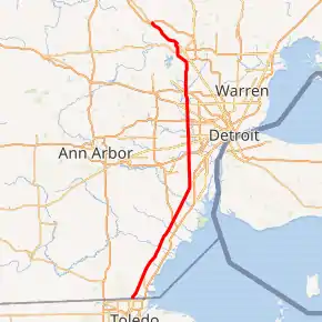 Like other state highways in Michigan, US 24 is maintained by the Michigan Department of Transportation (MDOT). In 2011, the department's traffic surveys showed that on average, 85,302 vehicles used the highway daily between the "Mixing Bowl" and 12 Mile Road and 6,401 vehicles did so each day in southern Monroe County, the highest and lowest counts along the highway, respectively.[3] All of US 24 north of I-275 is listed on the National Highway System,[4] a network of roads important to the country's economy, defense, and mobility.[5]