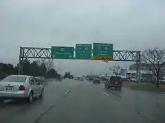 The interchange with I-94 had only two bridges and left hand exits were used throughout.[27] This interchange was reconfigured in 2005 to a SPUI design that was completed in December of that year.[28] A pair of bridges called the Gateway Bridge (alternately "Gateway to Detroit"[29]) was incorporated in the new interchange.[30]
