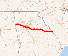 The route is concurrent with SR 6 from the Alabama state line to Lithia Springs, SR 100 and SR 1 in Cedartown, SR 8 from Lithia Springs to Decatur, SR 5 from Lithia Springs to Austell, and SR 10 from Atlanta to Avondale Estates, and again from Thomson to the South Carolina state line. It is entirely concurrent with SR 12 for 118 miles (190 km),[3] and is briefly concurrent with the southern terminus of SR 124 in Lithonia.