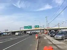 In 1954, plans were made to replace the intersection with DE 41/DE 141 in Basin Corner with a modified cloverleaf interchange in an effort to reduce traffic congestion.[27] Construction on the interchange began in September of that year.[28] The interchange between US 13/US 40/US 202 and DE 41/DE 141 was completed in 1956.[23][29] In 1958, construction began for a bridge at the Farnhurst interchange that would link the US 40 approach to the Delaware Memorial Bridge to the Delaware Turnpike that was proposed to run west to the Maryland border.[30] A year later, the Farnhurst interchange and the bridge approach were upgraded to Interstate Highway standards, and it was designated as part of I-295.[31][32] Construction at the interchange connecting to the Delaware Turnpike at Farnhurst was completed in July 1961. On November 14, 1963, the Delaware Turnpike opened to traffic, with I-295 extended west to I-95 at the northern terminus of the turnpike.[33][34] In the middle of 1964, work began on a second span at the Delaware Memorial Bridge due to increasing traffic volumes. The second span of the bridge was opened to traffic in fall 1968.[35][36]
