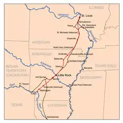 The southwest-northeast bisector of Arkansas has always been an integral motor route.[6] Prior to designation as US 67, the route was known as the Southwest Trail, an old military road around 1803.[6] The Southwest Trail connected St. Louis, Missouri with Texas by steamboat in Fulton, Arkansas.[7] The main railroad was built along the Southwest Trail, which developed many towns along the route. President Andrew Jackson appropriated money for the route in 1831, and designated it as a National Road. Although the route shifted slightly, it always has followed the natural break between the Ozark Mountains and the Ouachita Mountains and the Mississippi Alluvial Plain.