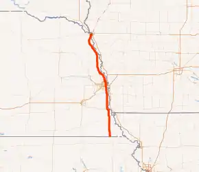 U.S. Highway 75 (US 75) is a part of the United States Numbered Highway System that runs for 1,239 miles (1,994 km) from Dallas, Texas to Kittson County, Minnesota where it ends just short of the Canada–United States border. Within the State of Nebraska it is a state highway that enters Nebraska on the Kansas state line about 9 miles (14 km) south of Dawson and travels north across the extreme eastern portion of the state, to the Nebraska–Iowa border in South Sioux City where it crosses the Missouri River along a concurrency with Interstate 129. The northern 210 miles (340 km) of the route generally travels parallel to the Missouri River. The 87.32-mile (140.53 km) section between the I-680 interchange in Omaha and the Interstate 129 interchange is designated the Lewis & Clark Scenic Byway, one of nine scenic byways in the state.[1][2]