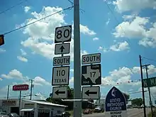 U.S. Route 80 or U.S. Highway 80 (US 80) is a major east-west United States Numbered Highway in the Southern United States, much of which was once part of the early auto trail known as the Dixie Overland Highway. As the "0" in the route number indicates, it was originally a cross-country route, from the Pacific Ocean to the Atlantic Ocean. Its original western terminus was at Historic US 101 in San Diego, California. However, the entire segment west of Dallas, Texas, has been decommissioned in favor of various Interstate Highways and state highways. Currently, the highway's western terminus is at an interchange with Interstate 30 (I-30) on the Dallas–Mesquite, Texas city line. The highway's eastern terminus is in Tybee Island, Georgia near the Atlantic Ocean.[3] Between Jonesville, Texas and Kewanee, Mississippi, US 80 runs parallel to or concurrently with Interstate 20. US 80 also currently runs through Dallas, Texas; Shreveport, Louisiana; Jackson, Mississippi; Montgomery, Alabama; Columbus, Georgia; Macon, Georgia; and Savannah, Georgia.