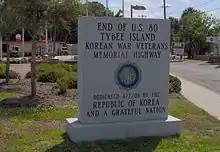 Beyond Macon, US 80 turns southeastward, passing through the cities of Dublin, Swainsboro and Statesboro and running roughly parallel to I-16. On the outskirts of Savannah, US 80 crosses I-95 and follows Louisville Road into the city's downtown area. After briefly merging with I-516, US 80 continues eastward along Victory Drive, just south of Savannah's historic district. At the community of Thunderbolt, US 80 crosses the Wilmington River and proceeds across the islands and marshes along the Atlantic Coast east of Savannah. There it crosses the Lazaretto Creek onto Tybee Island. The final stretch of US 80 follows Butler Avenue across Tybee Island. The highway terminates at 19th Street, a few hundred feet from the ocean. A small monument at the intersection of Butler and Tybrisa Street marks the end of the highway.