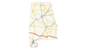 U.S. Route 84 (US 84) in Alabama travels west to east across southern Alabama for 237.400 miles (382.058 km). US 84 enters the state from Mississippi west of Silas and exits into Georgia southeast of Gordon. Along its route, US 84 passes through the limits of the towns and cities of Silas, Coffeeville, Grove Hill, Repton, Evergreen, River Falls, Andalusia, Sanford, Babbie, Opp, Elba, New Brockton, Enterprise, Level Plains, Daleville, Dothan, Cowarts, Avon, Ashford.