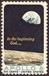 The mission was accomplished with the first manned launch of a Saturn V rocket. Apollo 8 was the second manned mission of the Apollo Program. While orbiting the Moon each man on board read a section from the Biblical creation story (verses 1–10) from the Book of Genesis, and it is this unprecedented historical event that is theme of the Apollo VIII issue's design, the issue being inscribed with the words, In the beginning God... superimposed on the photograph Earthrise, taken by Anders. Borman finished the broadcast by wishing a Merry Christmas to everyone on Earth.[17]