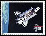 On June 22, 1995, in Anaheim, California, the USPS commemorated the Space Shuttle Challenger, STS-7, with the issuance of a 3-dollar postage stamp. Again designed by Phil Jordan, the stamp features the Challenger Space Shuttle. The name of the Space Shuttle was inscribed in microtype and secretly blended into the design matrix to satisfy concern about matters of security. This was the first time that the Post Office used an actual photograph from a NASA mission, instead of an illustration based on a photograph. This issue was also printed by Ashton-Potter USA, Ltd., on the offset-intaglio printer.