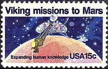 Upon close examination one can discern the engraving of the landing component used to collect soil samples on Mars, the radio dish, landing gear and other equipment rendered by the engraver in this issue. The U.S. Postal Service released this issue at Hampton, Virginia, on July 20, 1978, the second anniversary of the Viking I lander's descent on to the Martian surface.[4][30]