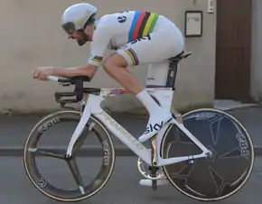 Rogers retained the title the following two years, finishing a minute and twelve seconds ahead of Rich in 2004,[14] and twenty-three seconds ahead of Spain's Iván Gutiérrez in 2005.[15] Rogers's run came to an end the following year, as Switzerland's Fabian Cancellara secured the victory in Salzburg, one minute and eighteen seconds ahead of American rider David Zabriskie.[16] The Swiss defended his title in 2007, finishing ahead of Hungarian and Dutch cyclists László Bodrogi and Stef Clement.[17] Germany's Bert Grabsch succeeded Cancellara, who was absent from the 2008 event in Varese, winning the title ahead of Canada's Svein Tuft and Zabriskie.[18] Cancellara returned in 2009 and reclaimed the rainbow jersey after beating Sweden's Gustav Larsson and Germany's Tony Martin in Mendrisio.[19] He won the rainbow jersey for a record fourth time the following year, with Millar and Martin finishing second and third, respectively. Cancellara was unsure whether he would compete beforehand, but stated: "It's maybe the hardest of all my wins because leading up to this I wasn't sure of my condition."[20]