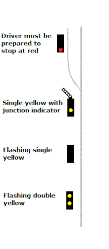 - Flashing double yellow - indicates that the next signal is showing flashing yellow.