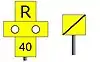 When there is a station between the warning board and the commencement board, a yellow repeater warning board showing an R is positioned beyond the end of platforms to remind drivers of the restriction ahead.[14]