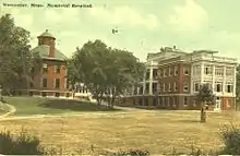 Memorial Hospital was founded in 1871 as the Washburn Dispensary.[2] Worcester industrialist Ichabod Washburn endowed it through a bequest in memory of his wife and daughters.[3] Memorial Hospital moved to its current location in 1888 and later merged with Hahnemann Hospital (founded in 1896) and Holden Hospital to become the Medical Center of Central Massachusetts.[2]