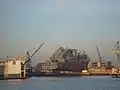 On 26 July 2007 one of the ship's four 200-ton diesel-electric engines toppled from a truck delivering it to the shipyard in the 2700 block of Harbor Drive, San Diego.[2] The engine damaged three vehicles, completely flattening one. A woman sleeping in the back of a van whose front-end was destroyed suffered minor injuries. The accident also created an 8-foot-deep (2.4 m) sink-hole in the roadway and ruptured a water main. The accident is believed to have been caused when the truck accidentally delivered the engine to the wrong gate of the shipyard and hit the curb while backing up in an attempt to turn around.[3] The engine was recovered on 29 July by three heavy cranes.[4]