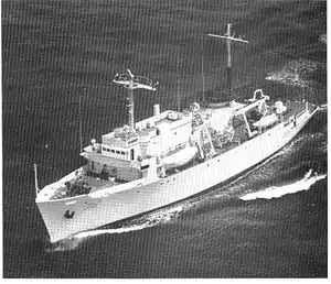 Although she had originally been intended to operate under the Oceanographer of the Navy, on 10 September 1968, S. P. Lee was placed under sponsorship of the Naval Underwater Research and Development Center, San Diego, California. Commanded by Capt. Paul L. Sinski, Master, the ship sailed to the Mediterranean and operated out of Naples conducting environmental acoustics tests for the 6th Fleet. For the next four years, but for a period in ready reserve status (7 April to 14 August 1972), she continued to conduct hydrographic operations for the navy in both the Atlantic and Pacific. On 25 September 1970, the ship was reclassified AG-192. S. P. Lee was placed back in ready reserve status on 29 January 1973, and transferred to the United States Geological Survey (USGS) on 27 February 1974.[1] The ship ranged from the Arctic to Antarctic on geology and geophysics missions for the agency.[3]