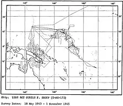 Reporting on 14 June, she teamed up with Harris County (LST-822) in the southwest Pacific Ocean, servicing survey sites which were being established to support the nation's missile and space projects. U.S. Air Force helicopters flew from her deck, and she carried four to six oceanographers from the Naval Oceanographic Office in Washington, D.C.. Charts and sailing directions for the historic World War II area were revised as a result. Between May 1963 and November 1965 78,500 nmi (90,300 mi; 145,400 km) of magnetic and other data were collected in an irregular pattern using LORAN-A, radar, celestial and dead reckoning control.[10]