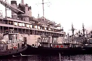 ![]() Naval Station Mayport, Florida, tugs Accohanoc (YTM-545) and Tomahawk, alongside Yosemite 1973. Note the two destroyers in the background, one of which is Charles R. Ware. | |