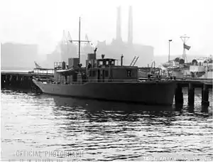 ![]() Broadside view of USS Aide De Camp (IX-224) at the Navy Local Defense Force base (Lockwood's Basin) base in East Boston, Mass., 14 June 1945. | |