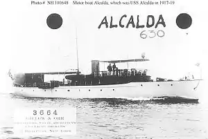 USS Alcalda (SP-630)—a yacht built in 1910 in New York at Port Jefferson on Long Island by I. M. Bayles & Sons—was acquired by the Navy on free lease from Mr. Farley Hopkins on 12 May 1917 though she was officially commissioned on the day before the transaction was completed. The vessel patrolled the waters of the 2nd Naval District to prevent incursions by German U-boats and to locate any mines laid by either U-boats or surface raiders. Alcalda was returned to her owner on 11 January 1919, and her name was stricken from the Navy list on that same day.