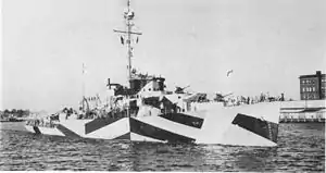 ![]() USS Allentown (PF-52) underway near Norfolk Navy Yard, Portsmouth, Virginia, on 9 August 1944. She is painted in Measure 32/16D dazzle camouflage. | |