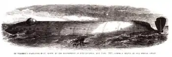 The ship was about 47 feet (14 m) long, with a beam of 4 feet 8 inches (1.42 m) and height of 5 feet 6 inches (1.68 m).[1] "It was made of iron, with the upper part pierced for small circular plates of glass, for light, and in it were several water tight compartments." She was designed to carry eighteen men. For propulsion, she was equipped with sixteen hand-powered paddles protruding from the sides, but on 3 July 1862, the Washington Navy Yard had the paddles replaced by a hand-cranked propeller, which improved its speed to about four knots.[2] Air was to be supplied from the surface by two tubes with floats, connected to an air pump inside the submarine, and was the first operational submarine to have an air purifying system.[3][1] The ship had a forward airlock, and was the first operational submarine with the capability for a diver to leave and return to the vessel while both remained submerged.[3][1] Divers could affix mines to a target, then return and detonate them by connecting the mine's insulated copper wire to a battery inside the vessel.[4]