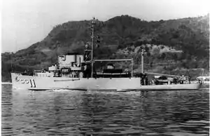 ![]() USS Ampere (ADG-11), heads out to sea c. 1955/1956. | |