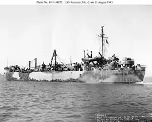 ![]() USS Amycus (ARL-2) off San Francisco, 10 August 1943. Note the 3"/50 caliber gun on the extreme stern with the Bofors 40 mm quad mount just forward of and above it. | |
