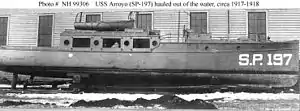 Arroyo was built as a civilian motorboat of the same name in 1913 by the Luders Marine Construction Company at Stamford, Connecticut. The U.S. Navy leased her for one dollar from her owner, Mr. A. M. Huntington, on 21 April 1917 for World War I service as a patrol vessel. She was commissioned as USS Arroyo (SP-197) at the New York Navy Yard at Brooklyn, New York, on 25 June 1917 with Boatswain G. W. Berry, USNRF, in command.