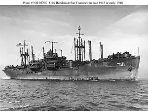 Bandera was decommissioned on 7 May 1946, returned to the Maritime Commission, and placed in the National Defense Reserve Fleet at James River on the 14th.[1] Her name was struck from the Navy list on 21 May. In 1955 Bandera was withdrawn from the Reserve Fleet as part of a Repair Program, GAA-A.H. Bull, and then returned.[1] On 23 January 1974 she was sold to Consolidated Steel Corporation, for $191,799.80, to be scrapped.[1] At 0900 EDT, on 1 April 1974 she was withdrawn from the Reserve Fleet and sent to the breaker's yard.[1]