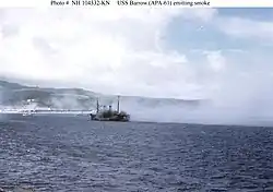 Barrow left Hawaii on 27 January 1945, bound via the Marshalls for the Marianas. She reached Eniwetok on 5 February, fueled from USS Gemsbok (IX-117) and provisioned before resuming the voyage to the Marianas on the 7th. She reached Saipan on 11 February. Bad weather postponed her scheduled practice landings for two days so that only a single rehearsal was carried out off Tinian's western shores on the 13th. The voyage to the Volcano Islands proved uneventful. Barrow - attached to Transport Group "Baker" (Task Group (TG) 53.2) - reached the immediate vicinity of Iwo Jima at dawn on D day, 19 February 1945, and lowered her first boats to the water at 0645. Soon, she sent the medical section of her beach party to the hospital configured tank landing ship, LST(H)-930, before transferring 76 marines to USS Starr (AKA-67) and sending nine of her boats to Lowndes. Barrow then remained in Transport Area "Baker", while the first assault waves landed at 0900. Surprisingly little fire greeted the initial landings, but soon the well dug in Japanese defenders began laying down a withering barrage from a variety of weapons. Before the day was out, 566 Americans were dead and 1,755 wounded.