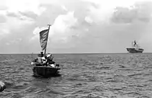 From 21 July 1979 through 30 June 1984, Blue Ridge and other ships in the West Pacific engaged in operation Boat People, receiving the Humanitarian Service Medal, rescuing refugees from Vietnam.[25] For example, on 6 October 1980 while transiting the South China Sea, Blue Ridge embarked Vietnamese refugees onboard from two separate small boats. The first being sighted before noon contained 54 total refugees. The second containing 37 were embarked onboard Blue Ridge shortly after 1800. Both boats were dangerously overloaded, and adrift when sighted. Of the 54 total refugees aboard the first boat, all were in good health, having been to sea only a few days. Of the 37 total refugees aboard the second boat, all were severely dehydrated, many so weak they could not stand, and had to be hoisted aboard Blue Ridge. Mechanical failure of the second boat had left the 37 adrift well short of the shipping lane. Initially it was unclear how long they had been at sea, though they had been without potable water for many days. Also on 15 May 1984 Blue Ridge rescued 35 refugees in the South China Sea, 350 nautical miles (650 km) northeast of Cam Ranh Bay.[42]