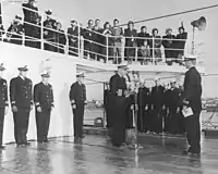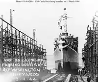 ![]() USS Castle Rock (AVP-35) off Houghton, Washington, on 6 October 1944, two days before commissioning. | |